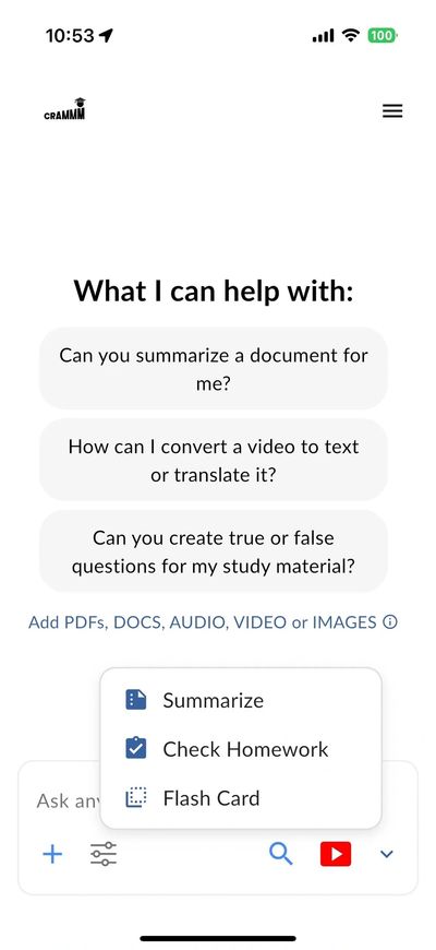 The Crammm mobile app puts the power of our web platform right in your hand. Now you can study flashcards on the go, when you have a few minutes on the campus bus or when waiting for friends. Take a picture of a whiteboard and get summary in seconds. Record a study session and send a transcripts to your classmates. Get reminders via SMS text or email from Crammm that its time to study, or postpone to when you can with just a reply.